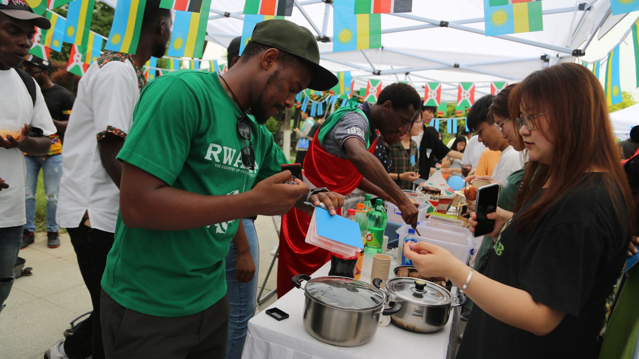 舞台下,国家文化展区,熙熙攘攘,人头攒动。来自25个国家的来华职工身着民族服饰,分享传统特色美食,通过手工艺品、民族乐器、互动游戏等展示国家文化。广大师生热情参与,品鉴美食,手持护照,在各国家盖章打卡,热闹非凡。
