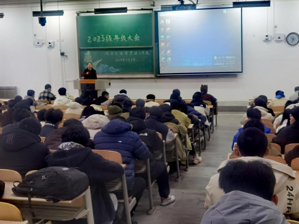 大会伊始,侯剑波通报了近期同学们上课情况及宿舍卫生情况,并提醒同学们保持宿舍卫生,严禁存放或使用违禁物品,牢牢守住安全底线和纪律红线,共同营造安全舒适的学习生活环境。之后,他就考试诚信问题再做提醒,要求同学们参加期末考试时要坚决摒弃投机取巧思想和侥幸心理,要认真备考,自信应试,诚信考试。他要求同学们要严守课堂纪律,杜绝迟到早退等违反课堂纪律的行为。同时,提醒同学们以本次年级大会为契机,及时总结及时反思,做好本学期结束前短期的学习生活规划。